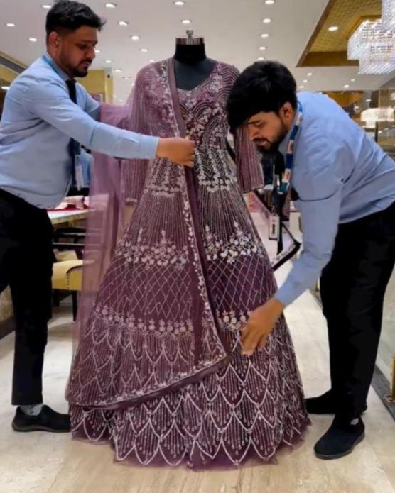 Elevate your bridal look with our Heavy Embroidery Sequins Work Lehenga! Crafted from luxurious soft net fabric, this masterpiece features intricate embroidery, shimmering sequins, and a flowing silhouette. Paired with a graceful dupatta, it ensures a regal and mesmerizing presence on your special day. Shine like a queen!