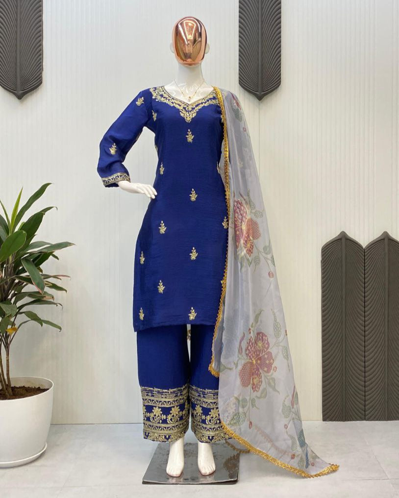 Designer Chinon Suit with Embroidered Pant & Printed Organza Dupatta