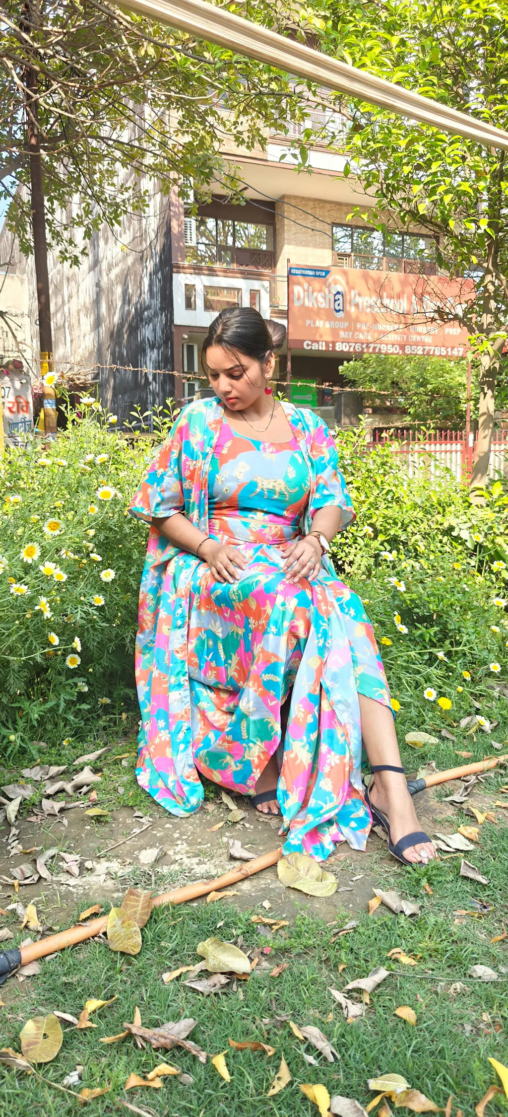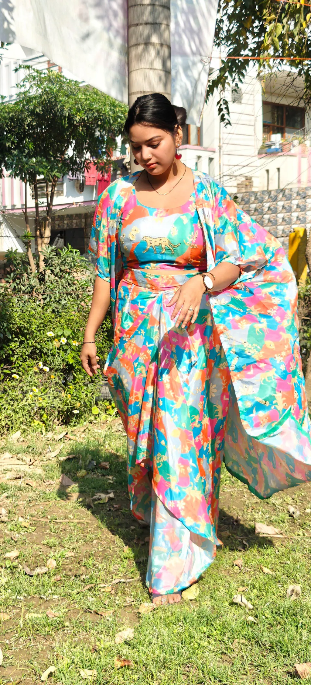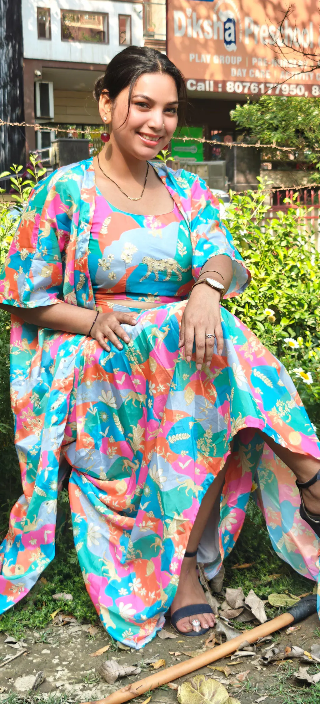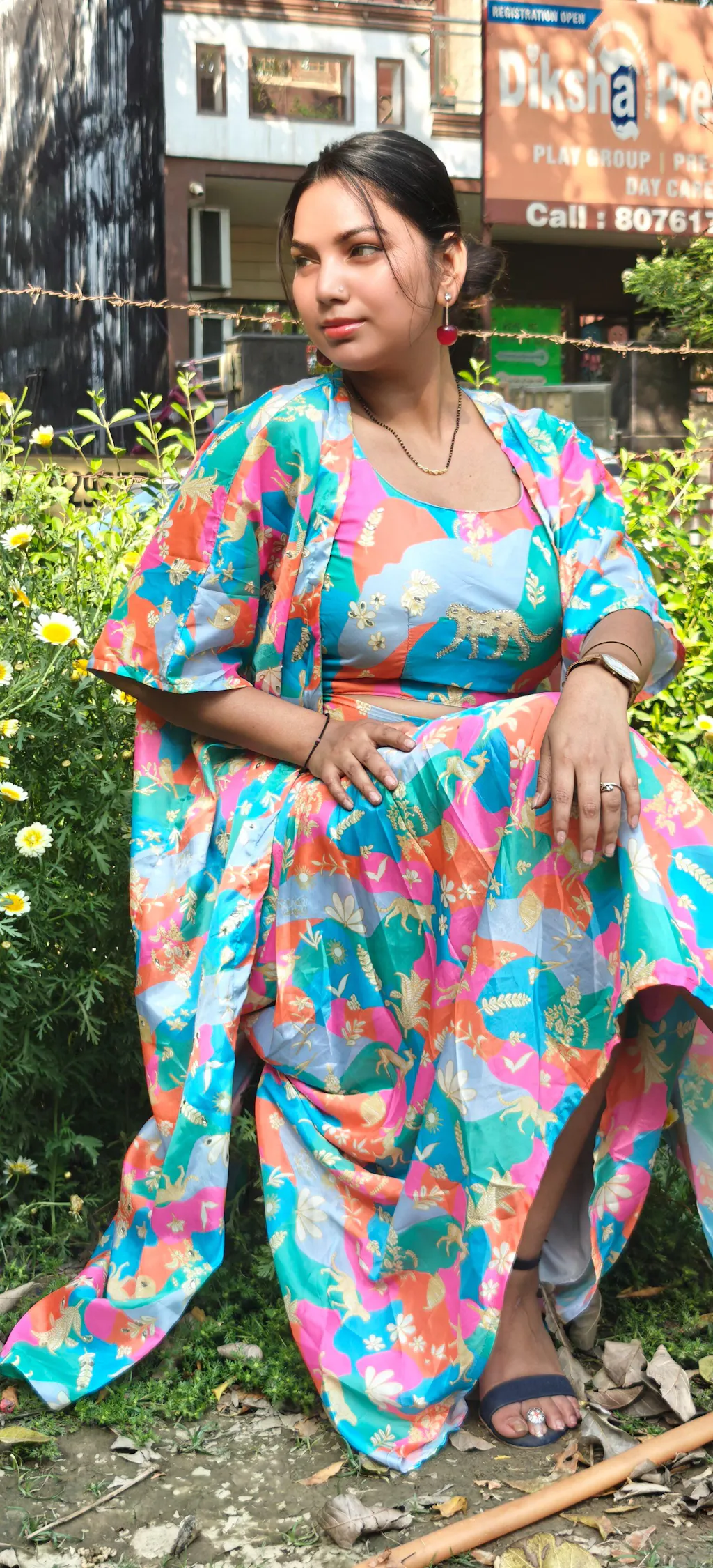 Designer Crepe Silk Western Set | Printed & Mirror Work Koti, Blouse & Stitched Bottom