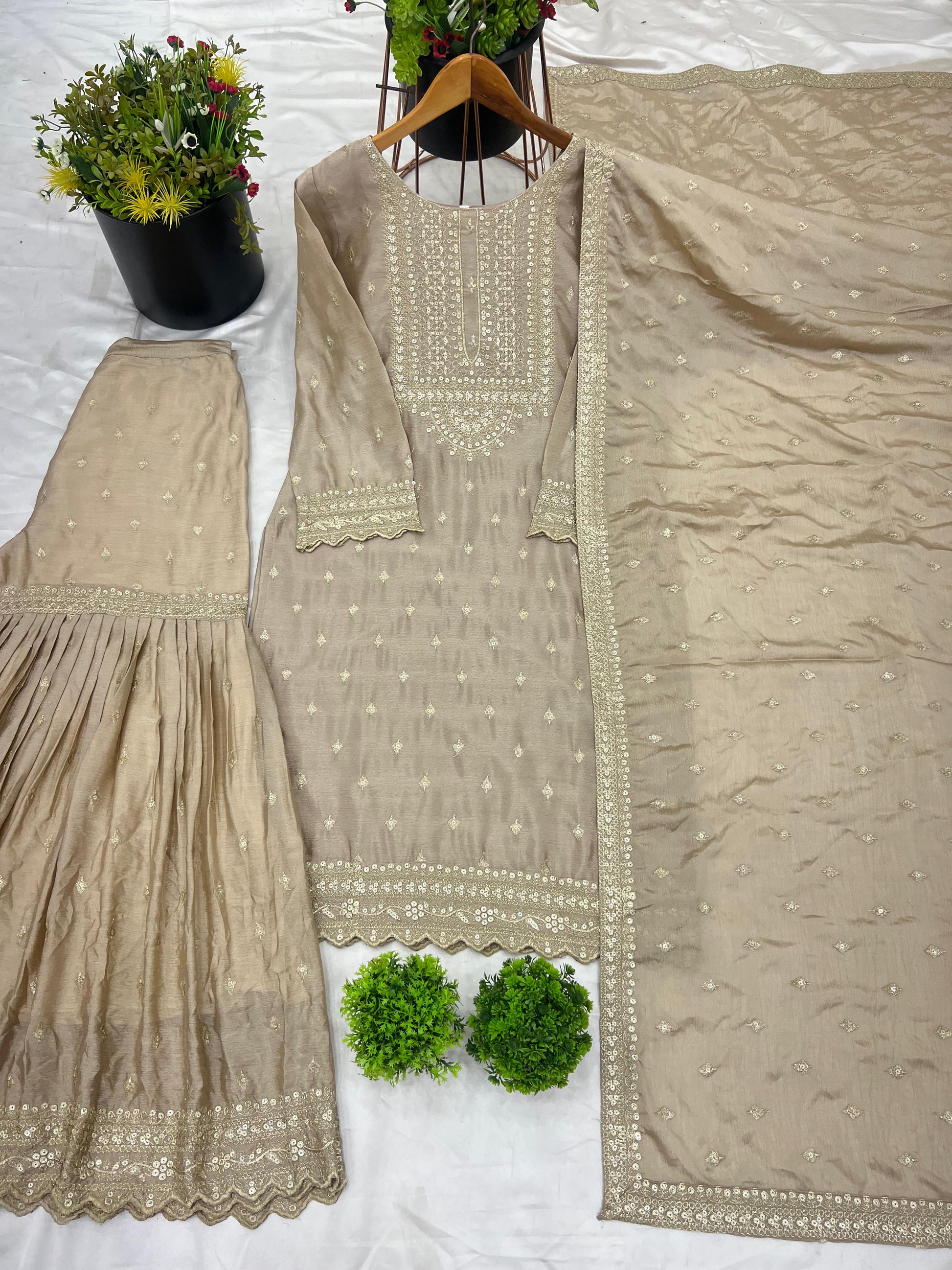 Step into elegance with this Designer Party Wear Sharara Set, crafted for festive occasions, weddings, and celebrations. Made with premium Chinon Silk and adorned with heavy embroidery and sequins, this set combines traditional charm with modern sophistication.