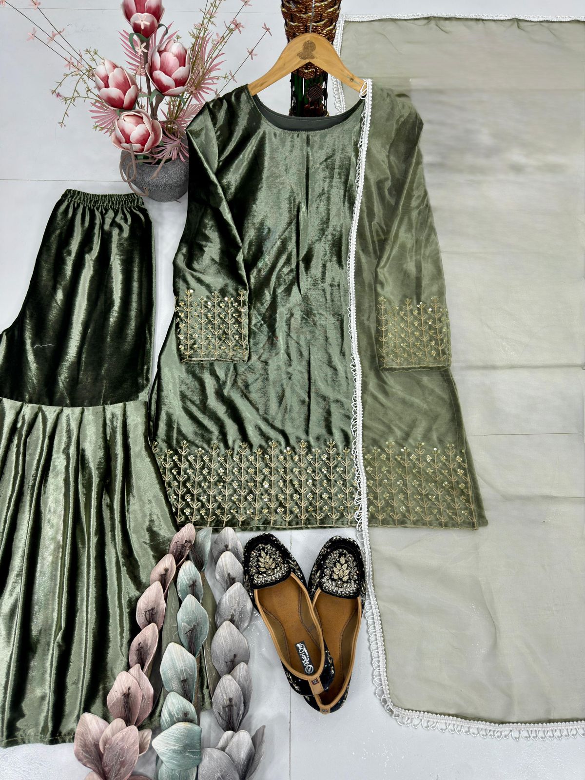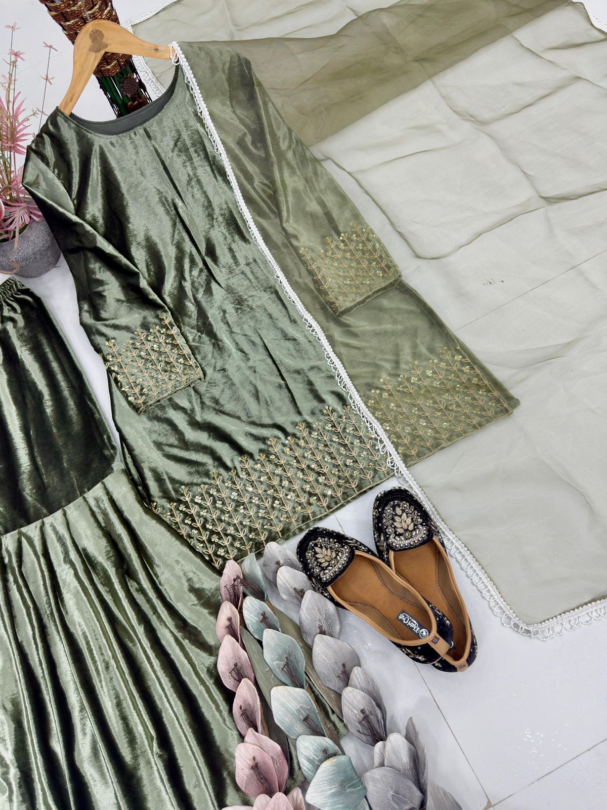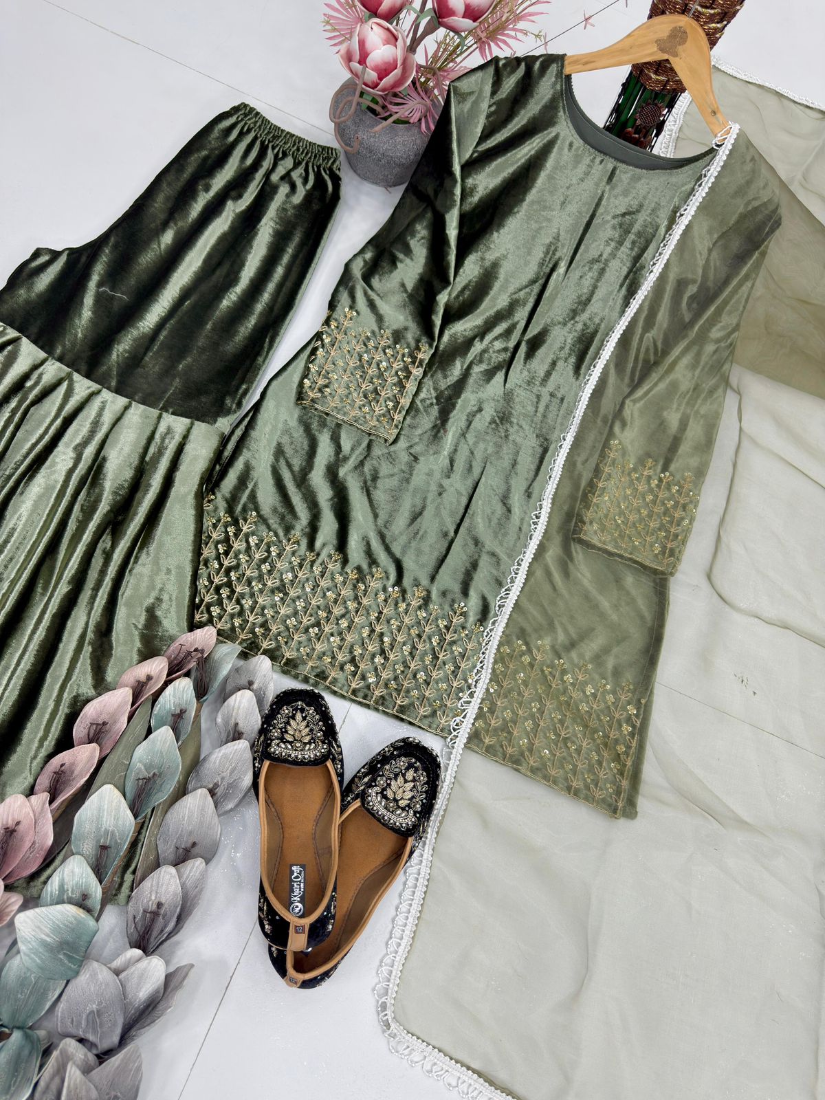 The fully stitched velvet top features heavy embroidery coding sequence work, adding shimmer and sophistication. Paired with a comfortable velvet sharara palazzo in a clean, plain finish, the set offers effortless elegance and ease of movement. Completing the look is a heavy soft net dupatta enhanced with a fancy four-side lace border, giving the outfit a refined finishing touch.