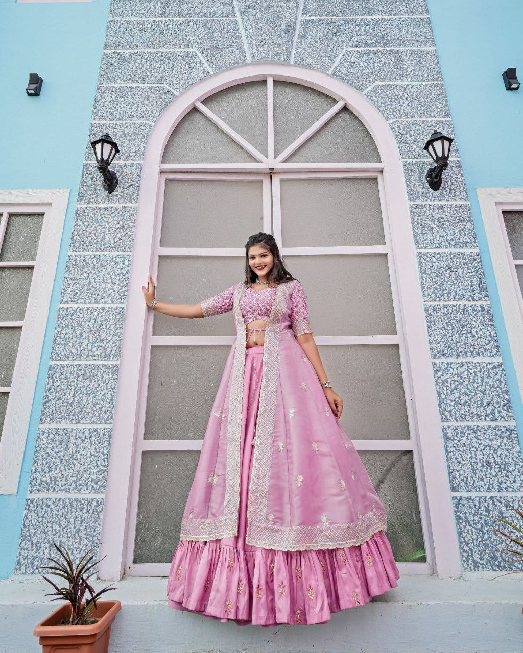 Dazzle in this Indo-Western ensemble, featuring a heavy Joya silk lehenga with zari embroidery and a 4-meter flair. The maslin blouse showcases intricate embroidery, sequence work, and crochet detailing. Completing the look, the Jimmy Choo fabric shrug adds a trendy touch. Perfect for any grand occasion!