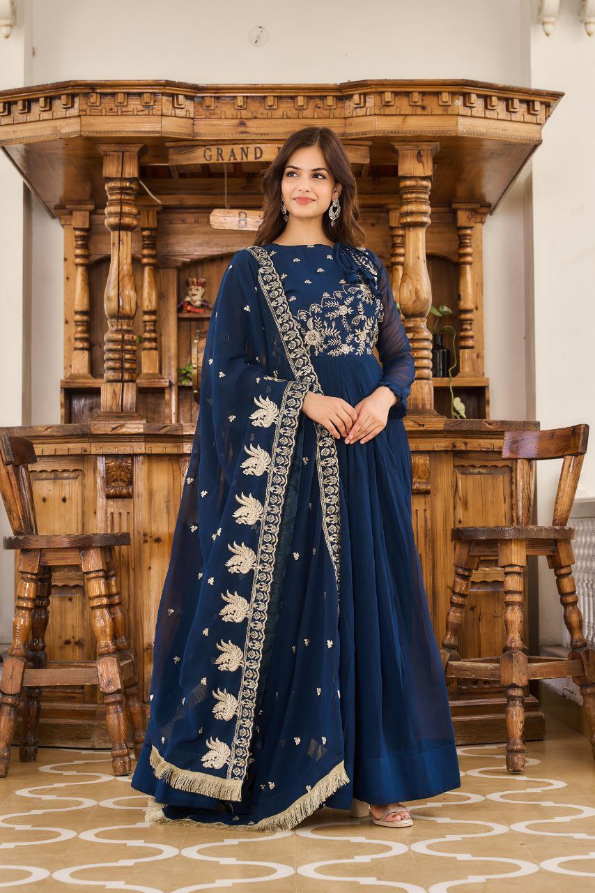 Elegant Fox Georgette Festival Long Gown & Dupatta – Premium Embroidery Work