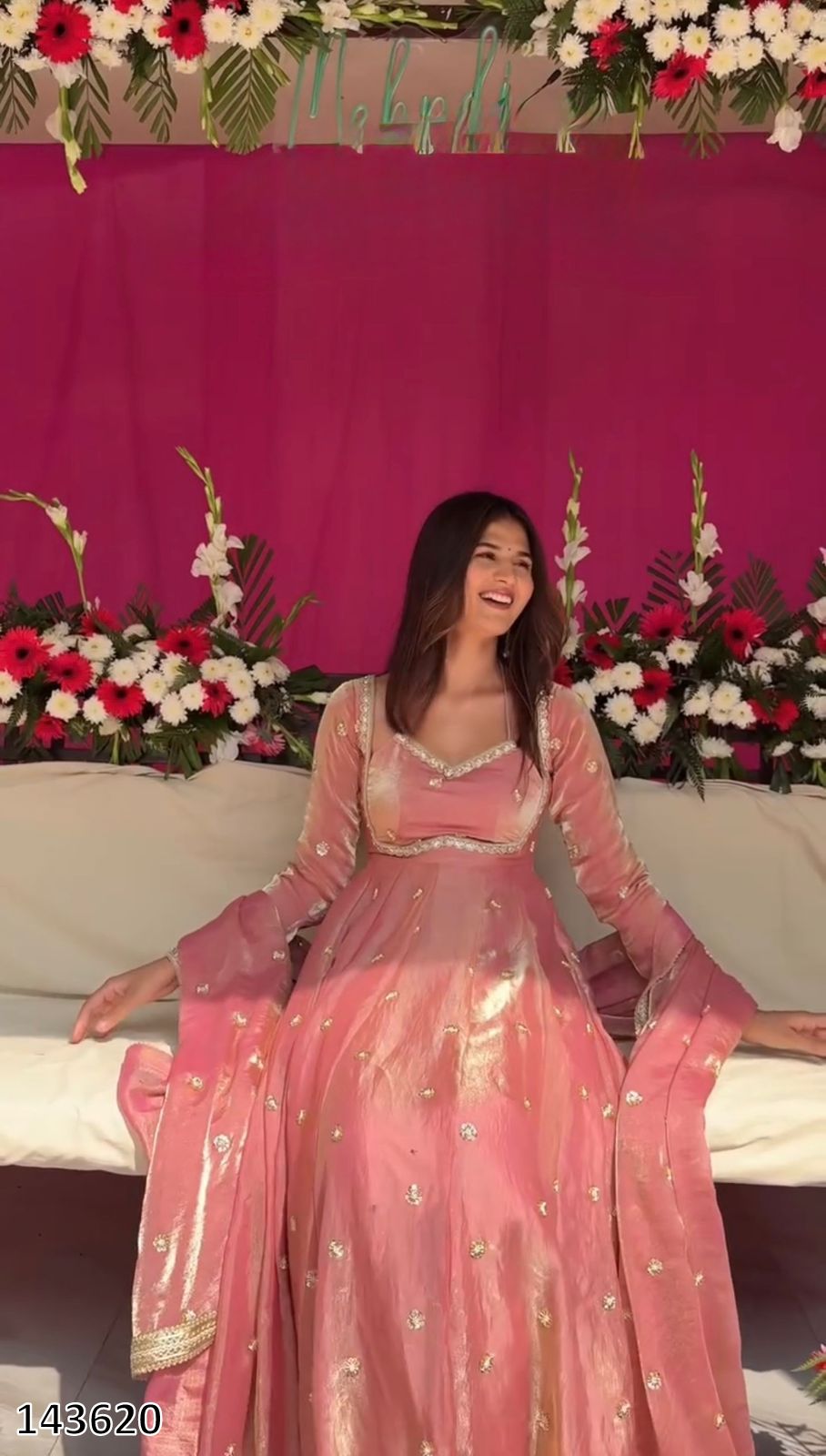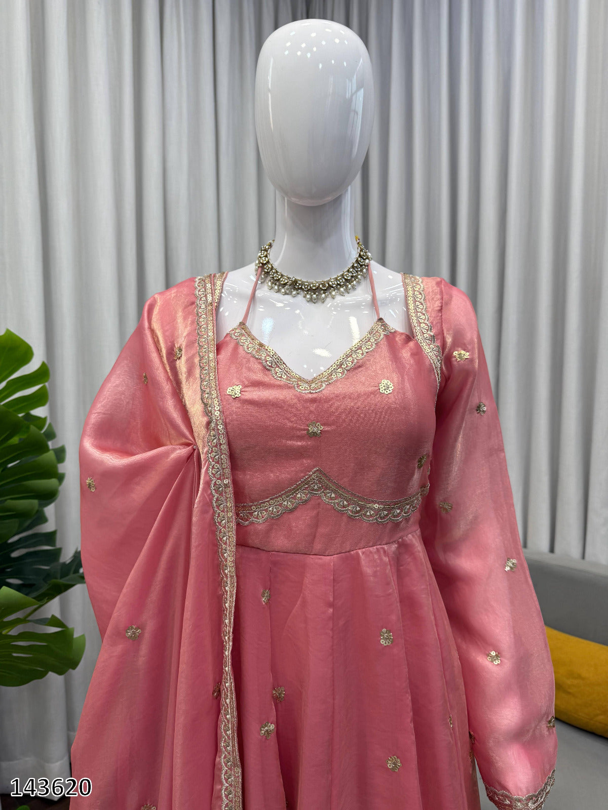 DN 143620 features a graceful Fendy silk Anarkali suit with rich thread and sequin embroidery, soft micro-cotton lining, and a flattering 3.5-meter flair. Paired with a comfortable elastic-waist pant and an embroidered lace-bordered dupatta, ideal for festive and celebration wear.