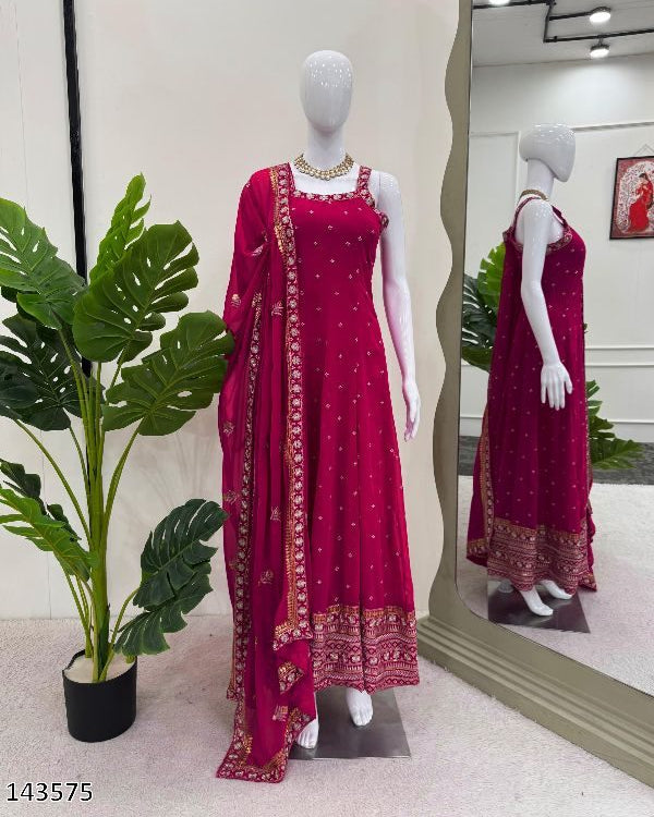 Step into elegance with this stunning faux georgette long gown sharara suit set. Beautifully crafted with intricate thread and sequin work, it’s the perfect blend of grace and comfort. Ideal for festive gatherings, special occasions, or party wear.