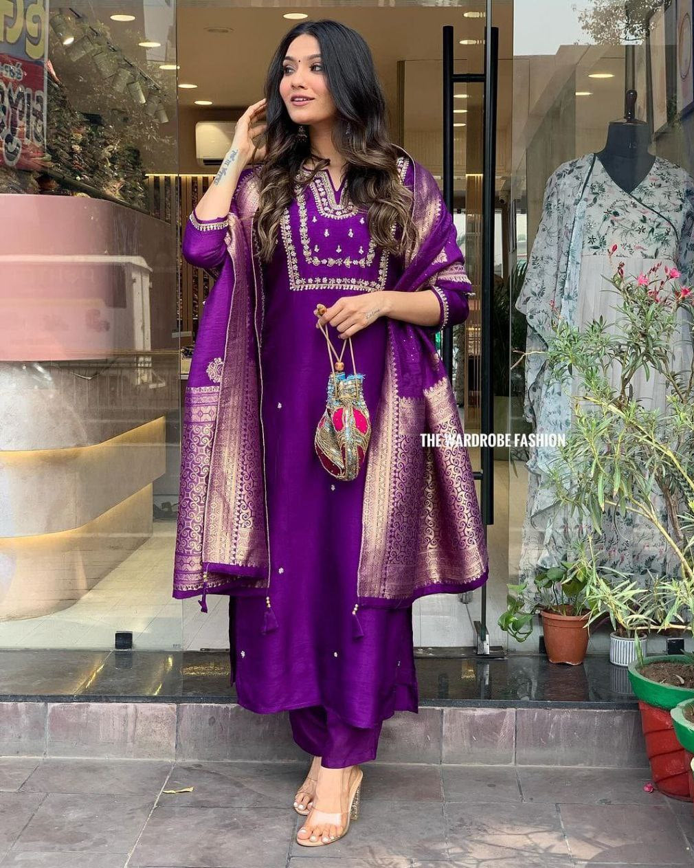 *Featuring beautiful Heavy Suit Set which is beautifully decorated with intricate embroidery Work, Zari weaving . It is paired with matching pants and Jequard Dupatta.*
