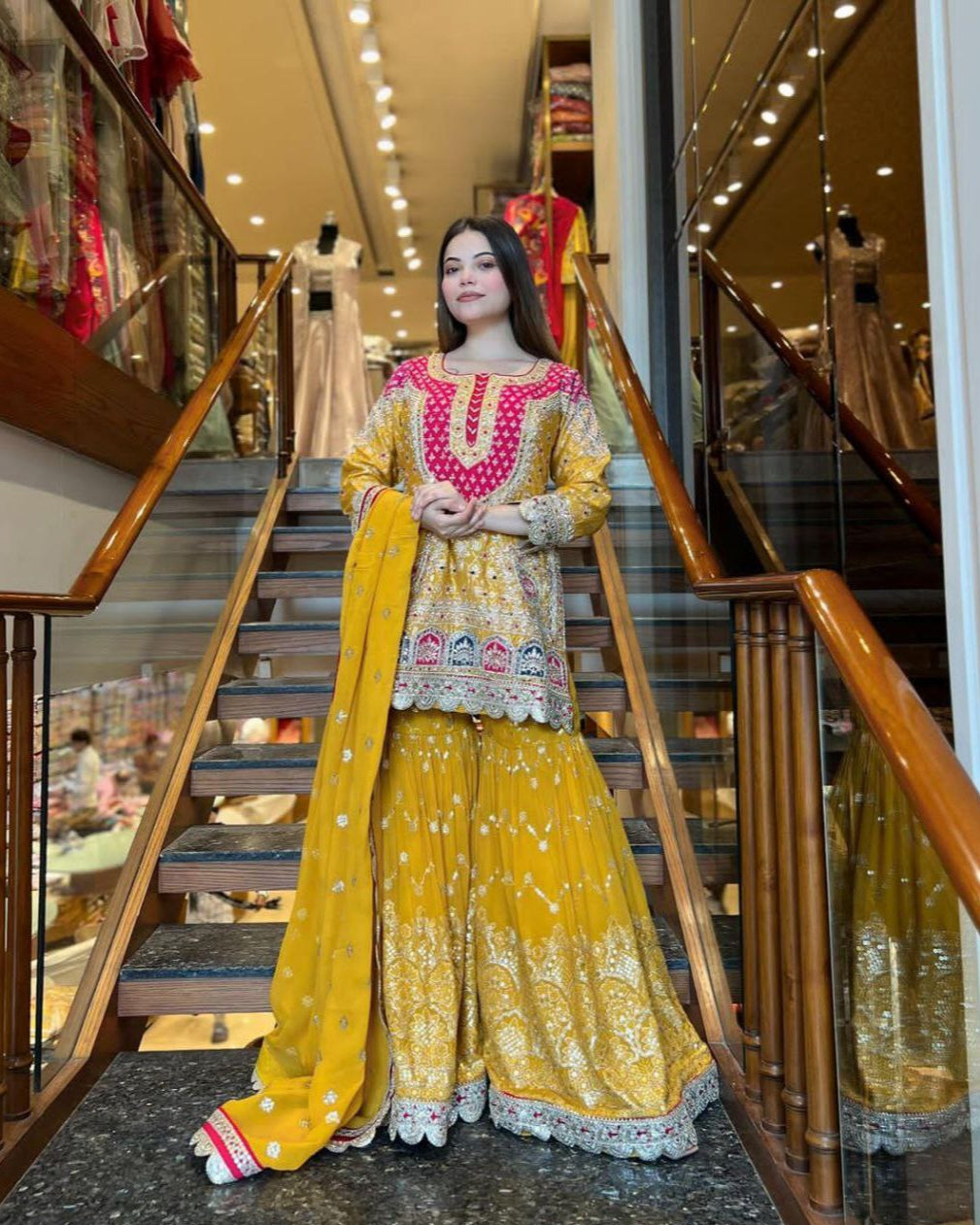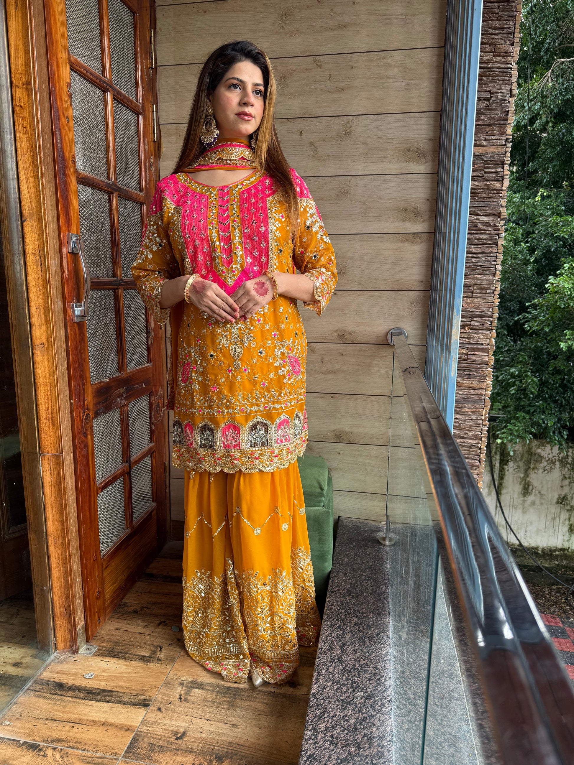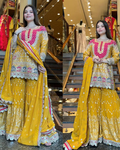 This stunning Heavy Faux Georgette Set features intricate 5mm embroidery sequence work on the top and sharara, paired with a digitally printed lace border dupatta. Fully stitched and ready to wear, it offers unmatched style and comfort. Perfect for special occasions—elevate your wardrobe with premium quality!