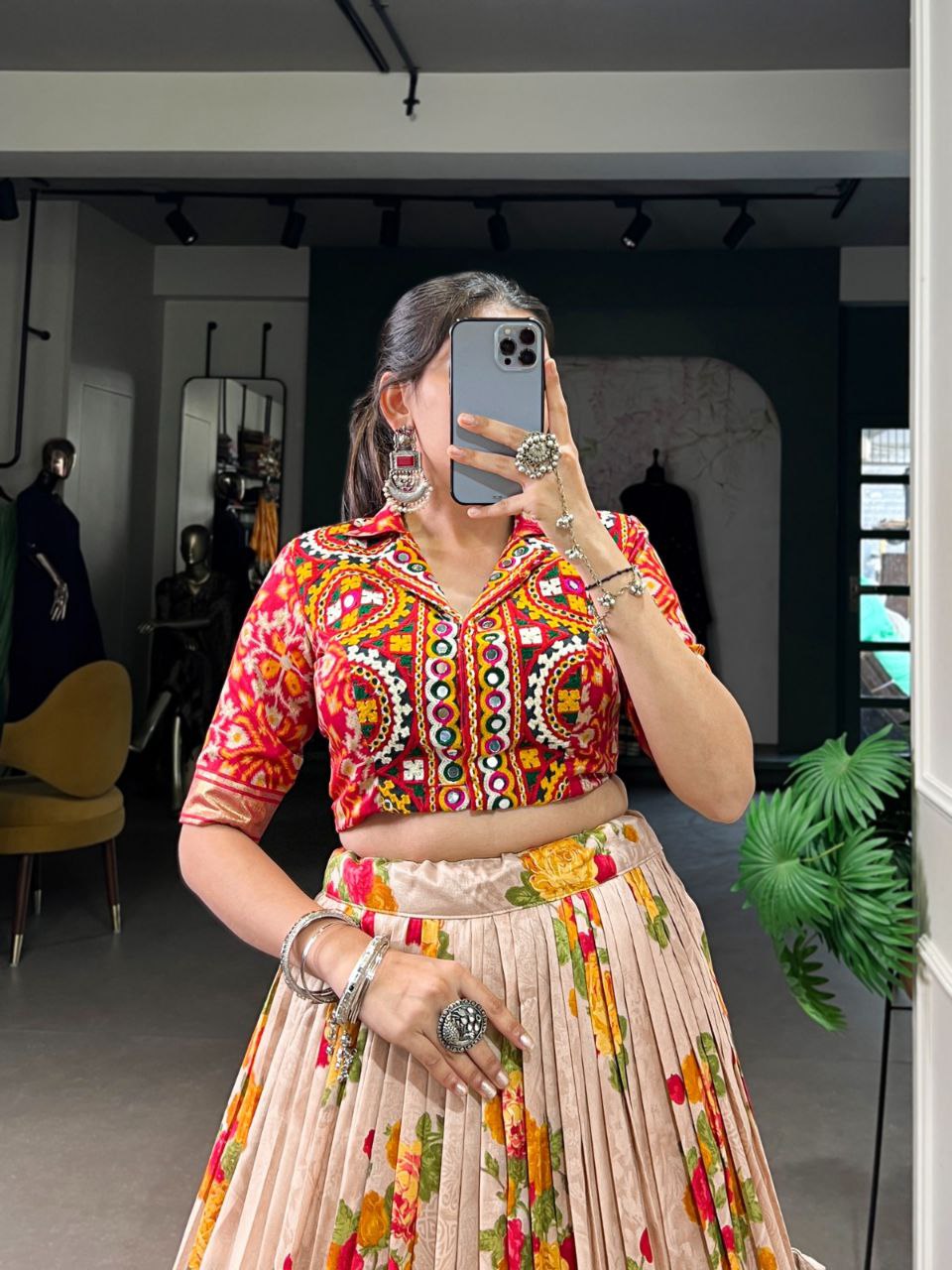 Step into the rhythm of Garba and Dandiya with this exquisite Navratri lehenga set, beautifully crafted with Patola and floral print, foil work, and rich mirror lace detailing. A must-have for your festive wardrobe!