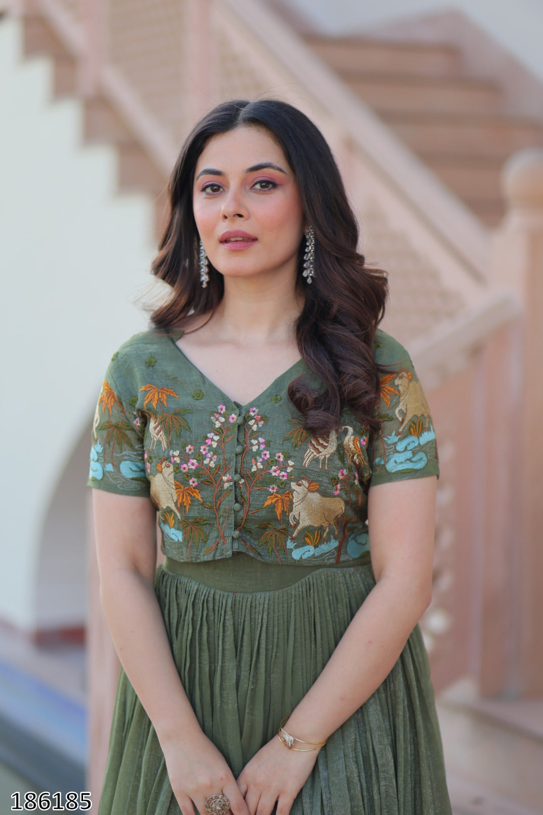 Pink & Green Premium Designer Silver Crunchy Fabric Koti-Gown with Embroidery