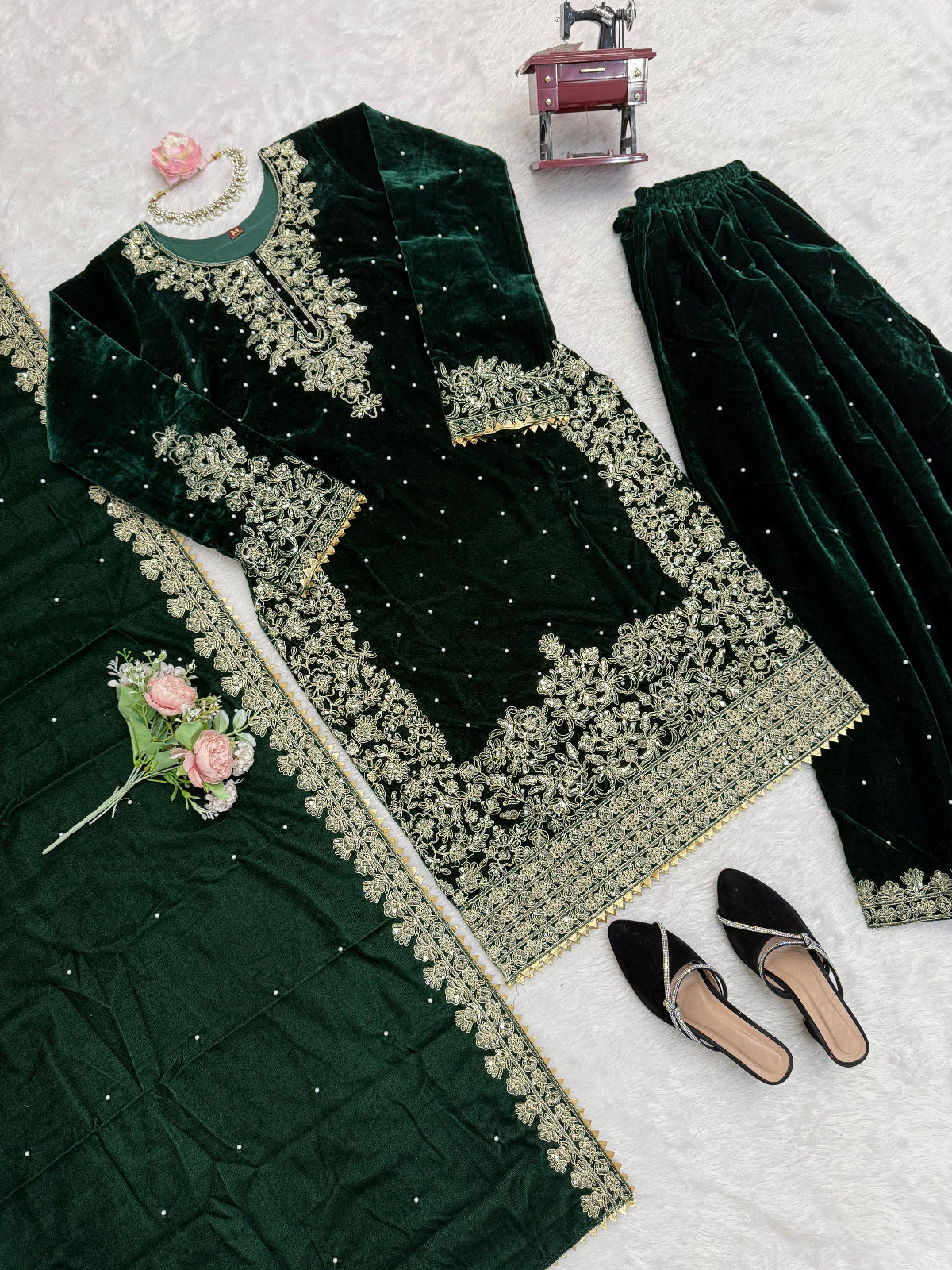 Premium Designer Viscose Velvet Top Plazzo Dupatta Set with Sequins & Coding Work – Party & Festive Wear