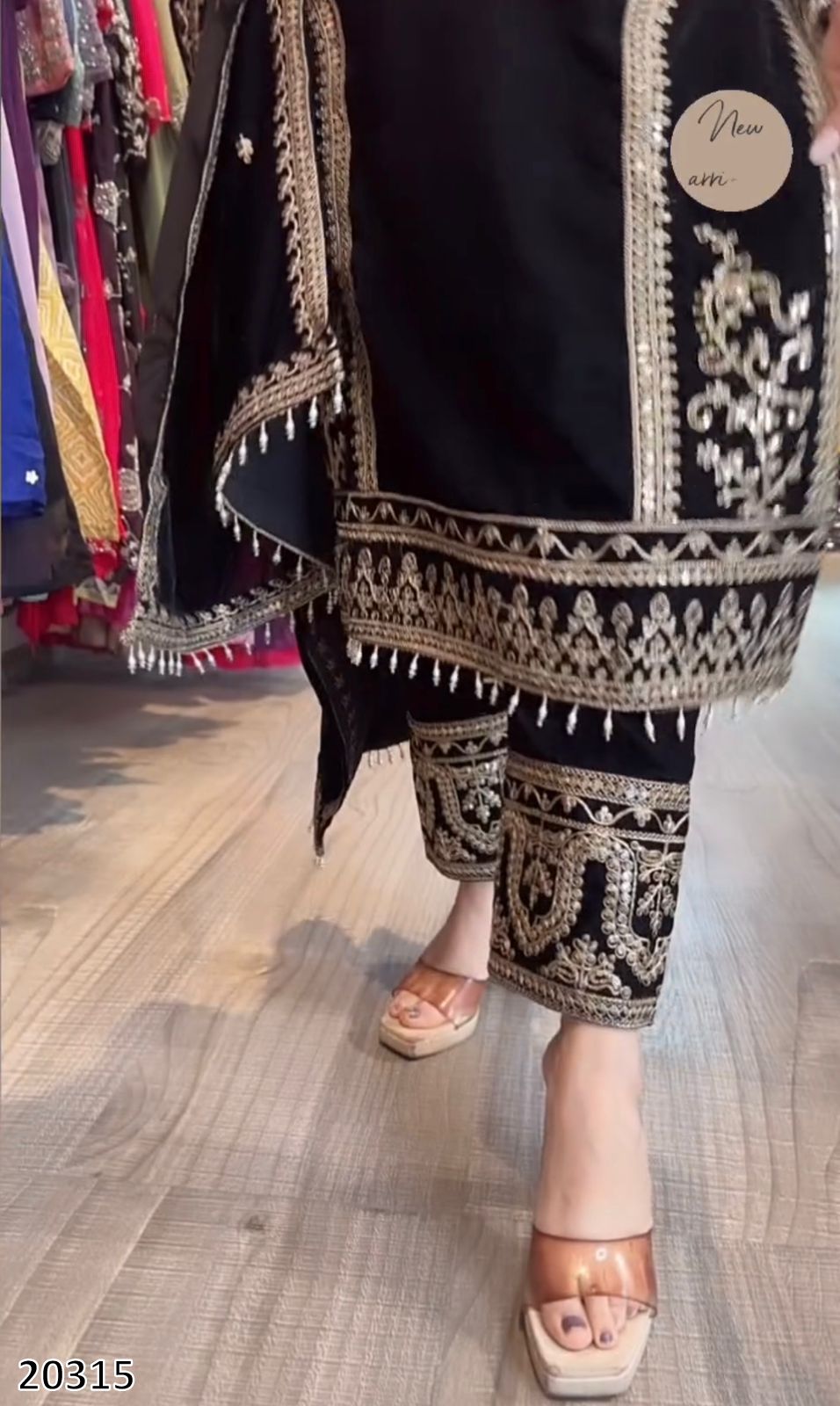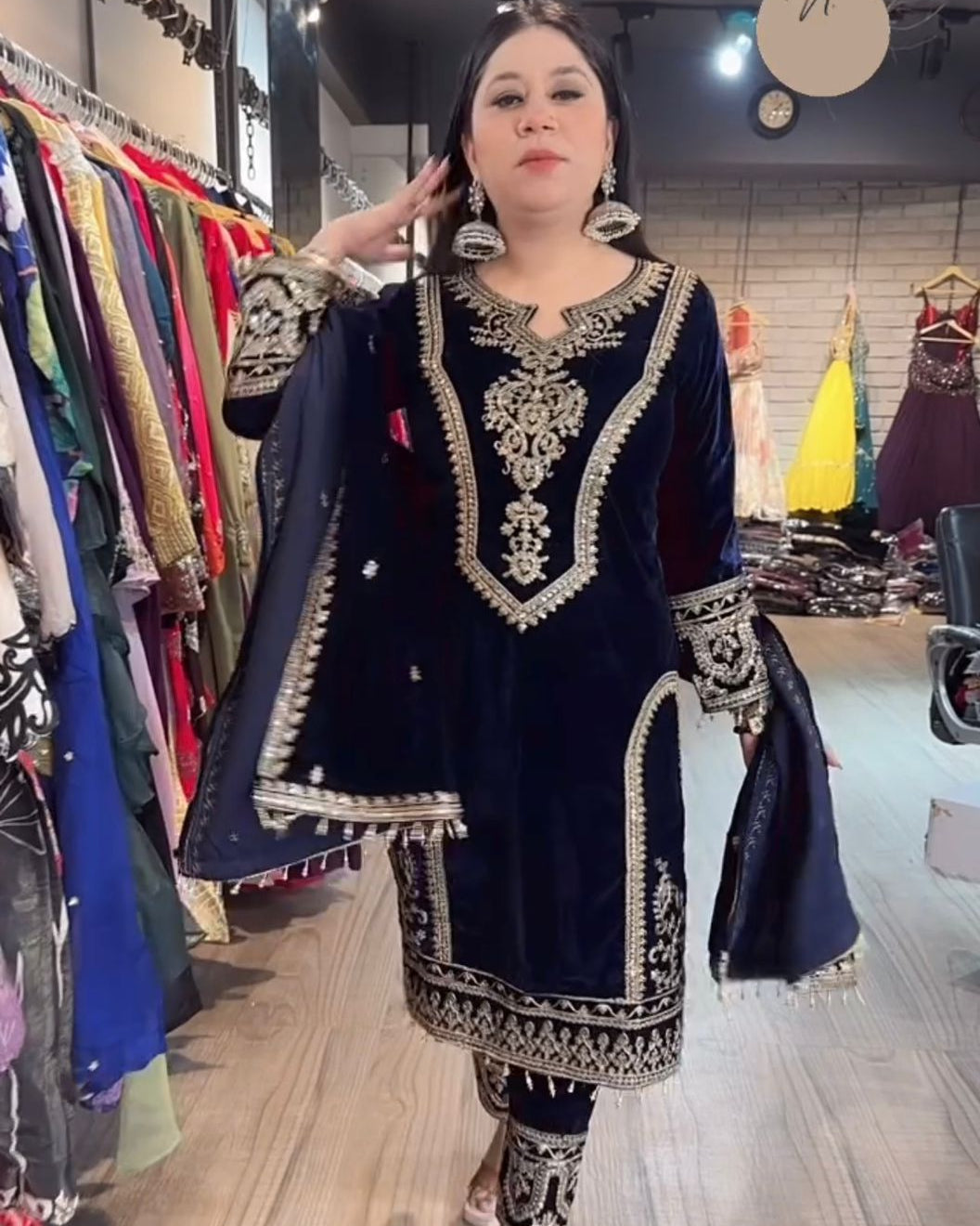 Heavy Pure Viscose Velvet Embroidered Top Palazzo Dupatta Set with Sequins & Coding Dori Work – Party Wear