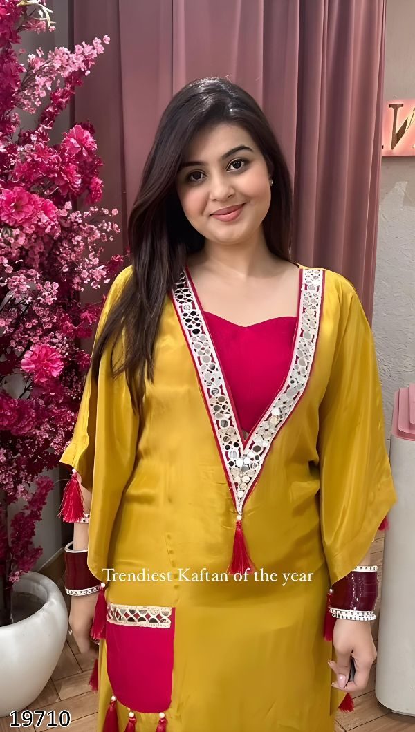 Step into elegance this festive season with this designer kaftan and pant set, beautifully crafted in premium Moss Satin fabric and adorned with real mirror work, moti handwork tussles, and a statement pocket for a refined and festive look.