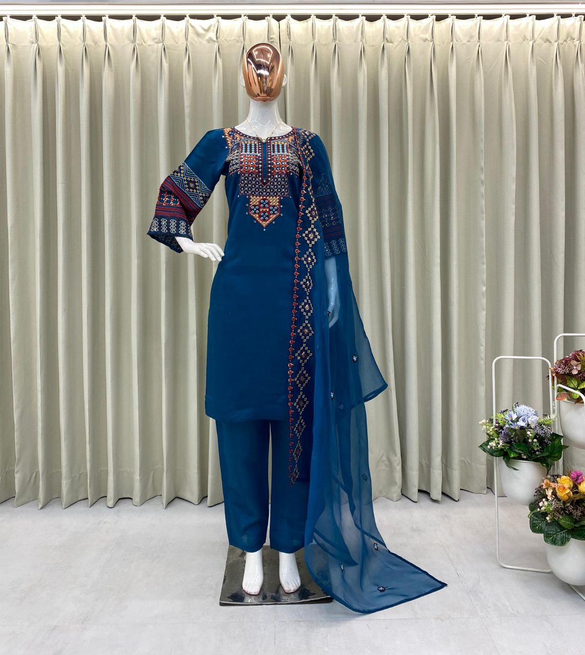 Roman Silk Embroidered Suit – Sequined Top, Pant & Organza Dupatta