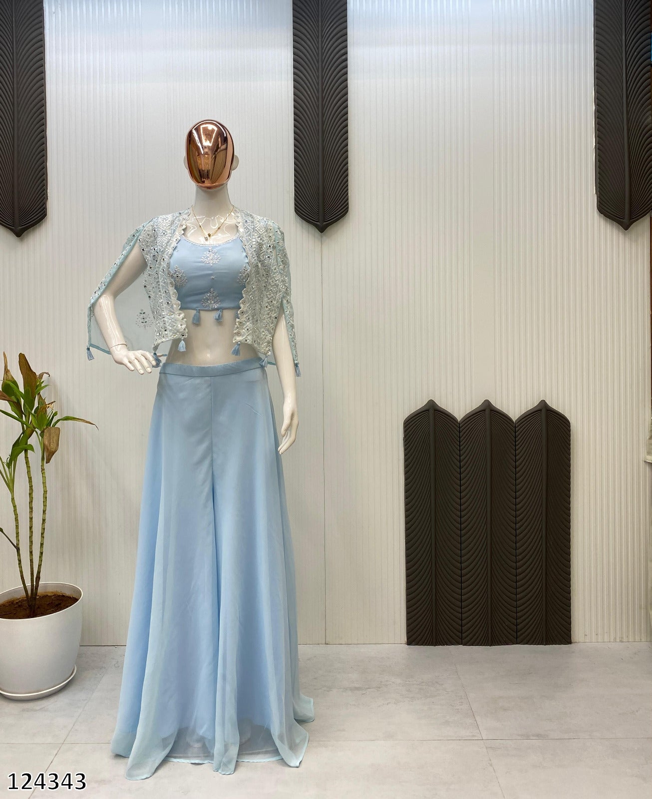 Crafted from premium Fox Georgette, this designer outfit comes with a chic blouse, flowy palazzo, and a beautifully embroidered shrug. Detailed with sequence embroidery and real mirror work, it’s a perfect balance of luxury and comfort—designed to make you shine at parties, weddings, and festive events.