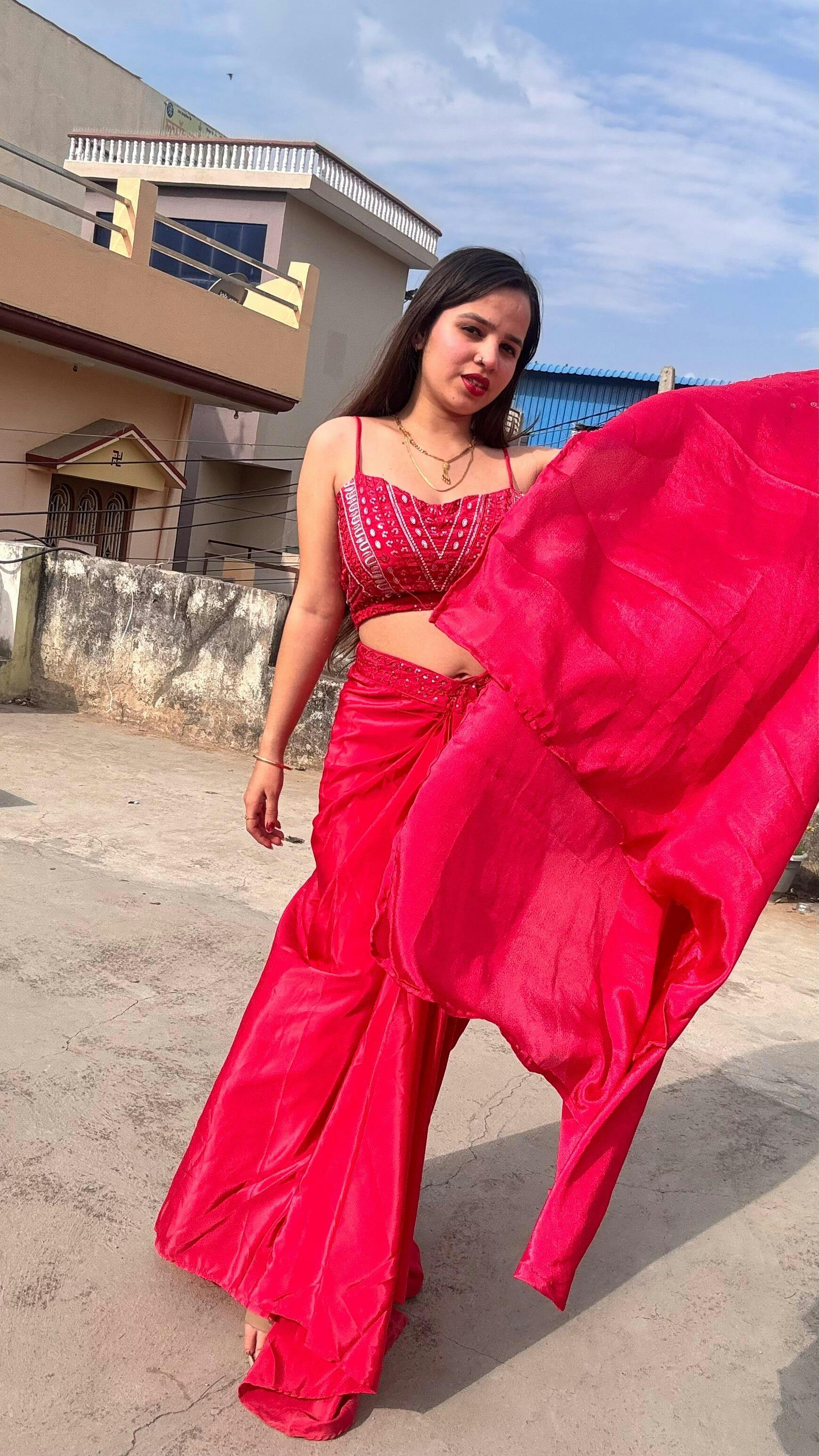 This trendy Three-Piece Western Outfit is perfect for the wedding season. The French silk tube blouse with sequence embroidery, paired with a French silk draped skirt, creates an elegant look. The chinon shrug completes the ensemble, all in free size. Light and stylish, weighing just 540gm. Ready for dispatch.